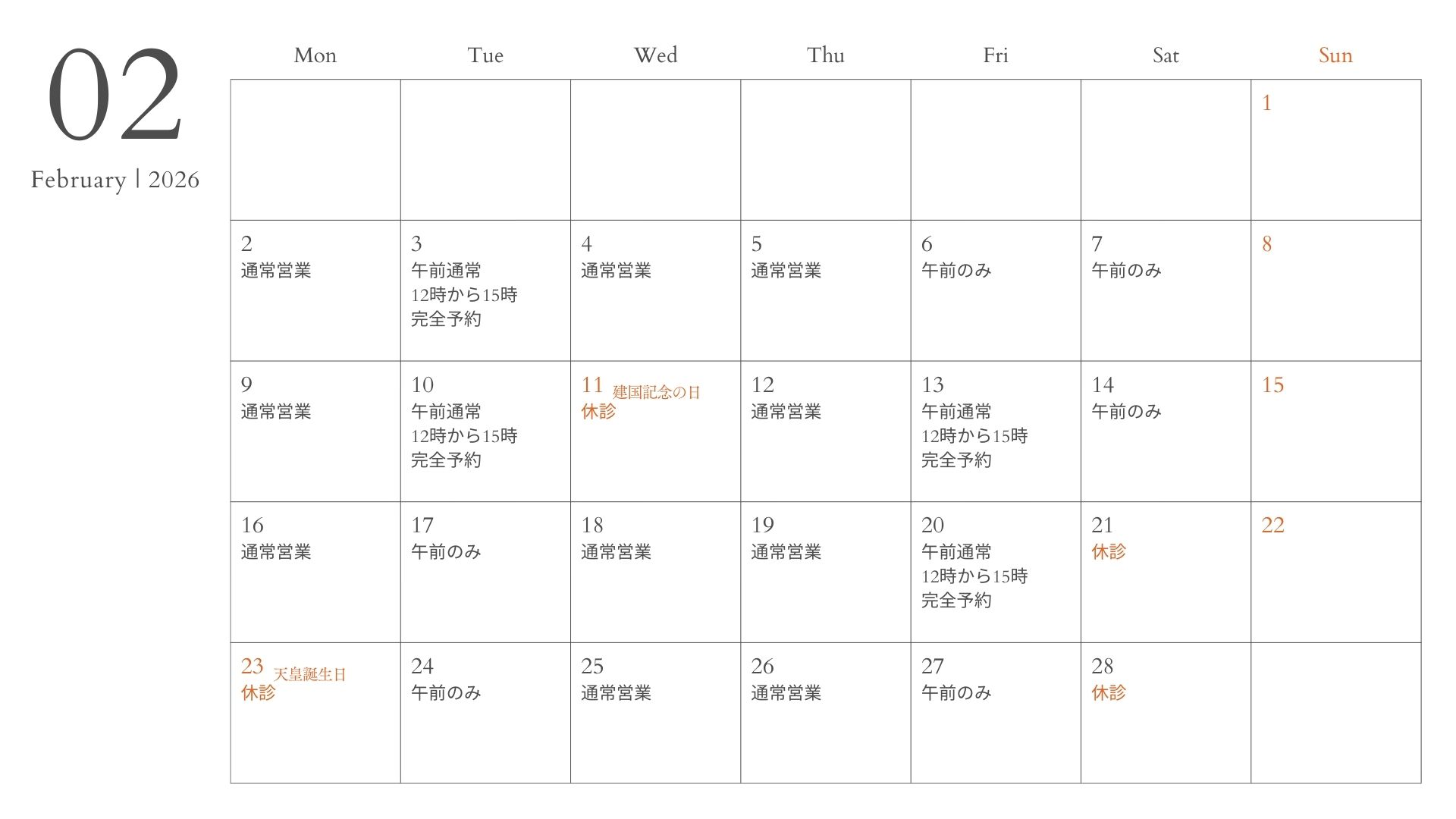 2月の営業日